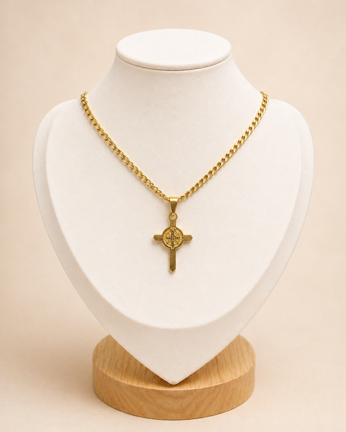 La cruz representa fe y protección, mientras que la medalla de San Benito es tradicionalmente asociada al resguardo espiritual. Juntas forman una pieza especial, discreta y con fuerte valor simbólico.