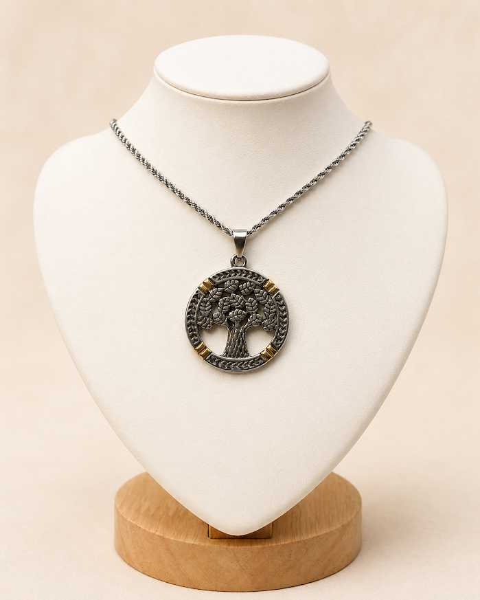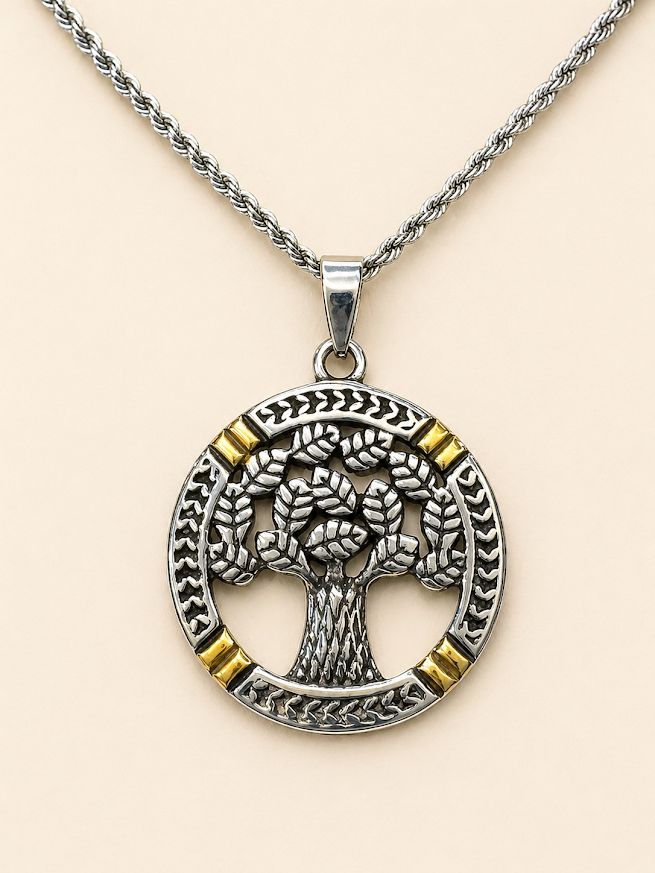 Este conjunto en acero quirúrgico con árbol de la vida combinado une significado, estilo y diseño en una sola pieza. Su dije circular resalta el clásico símbolo del árbol de la vida, acompañado por detalles combinados en tono plateado y dorado que le dan un acabado moderno, delicado y llamativo.