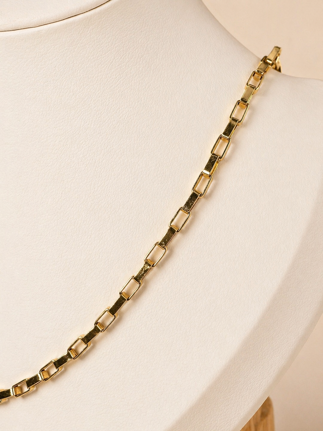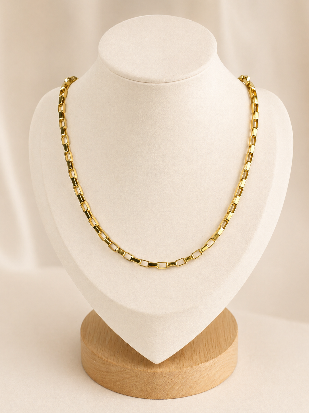 La Cadena Dorada es una pieza de estilo moderno y refinado, ideal para quienes buscan un accesorio con diseño limpio, liviano y elegante. Su trama de eslabones alargados tipo Forçet Lungo le aporta un aspecto actual y sofisticado, perfecto para realzar cualquier look con un toque sutil de brillo.