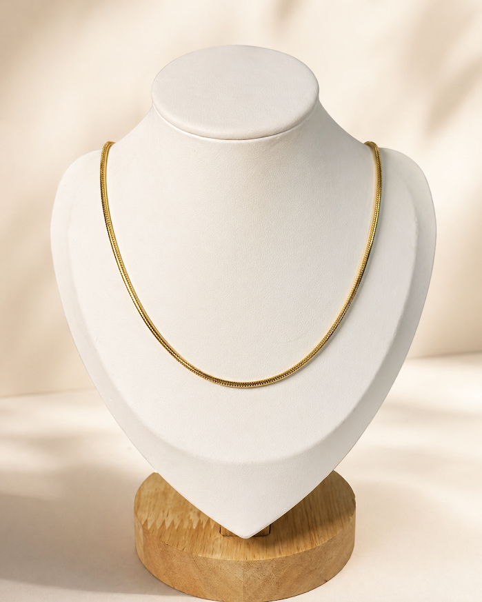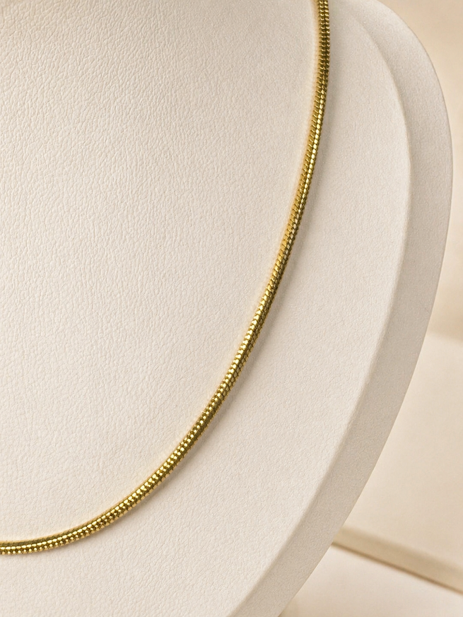 Esta cadena de acero quirúrgico dorado se destaca por su diseño tipo serpiente, de líneas suaves y terminación elegante. Es una joya delicada y atemporal, ideal para quienes buscan un accesorio fino, moderno y fácil de combinar.