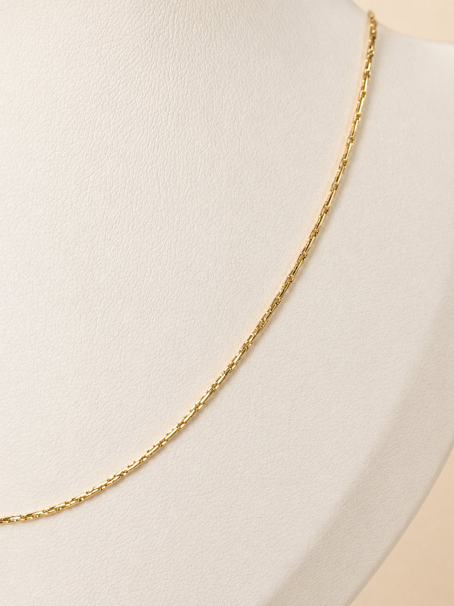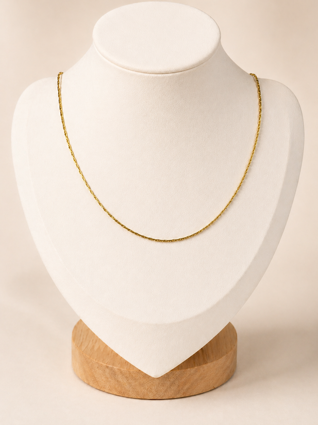 Esta cadena de acero quirúrgico dorado se destaca por su diseño fino, delicado y versátil. Es una joya ideal para quienes prefieren accesorios sutiles, elegantes y fáciles de combinar con distintos estilos.