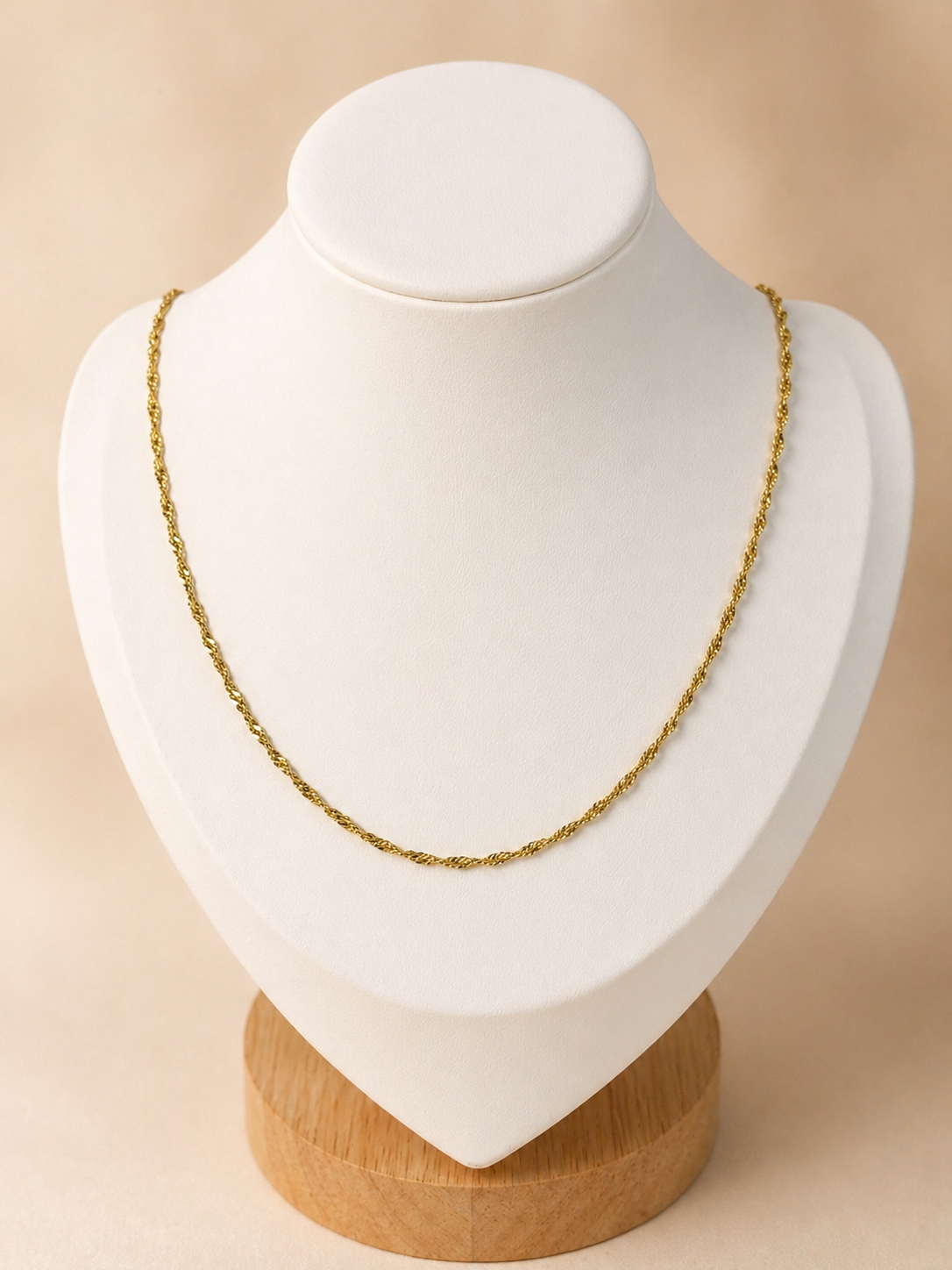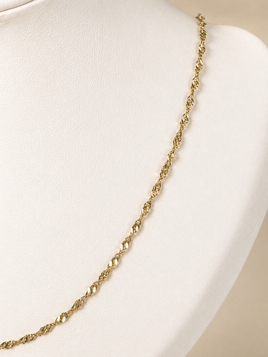 La Cadena Dorada Singapur Fina es una joya delicada y luminosa, pensada para quienes buscan un accesorio sutil, femenino y fácil de combinar. Su diseño tipo Singapur se caracteriza por una trama torcida que aporta brillo, movimiento y un detalle elegante sin perder liviandad.