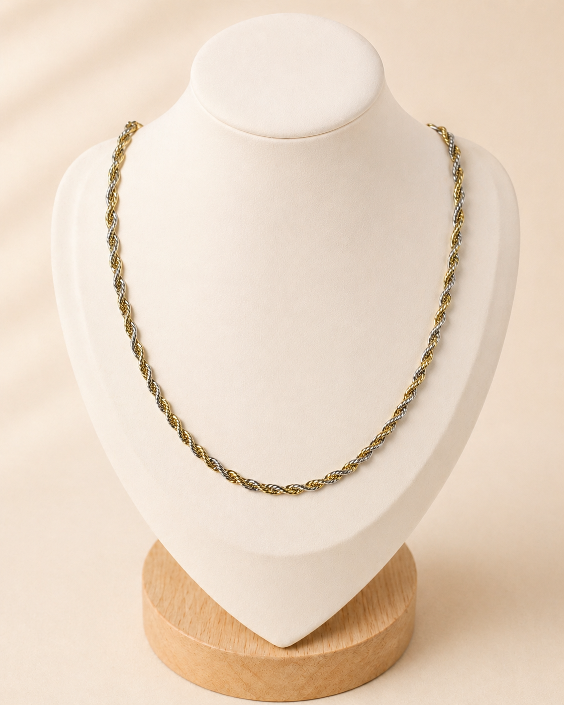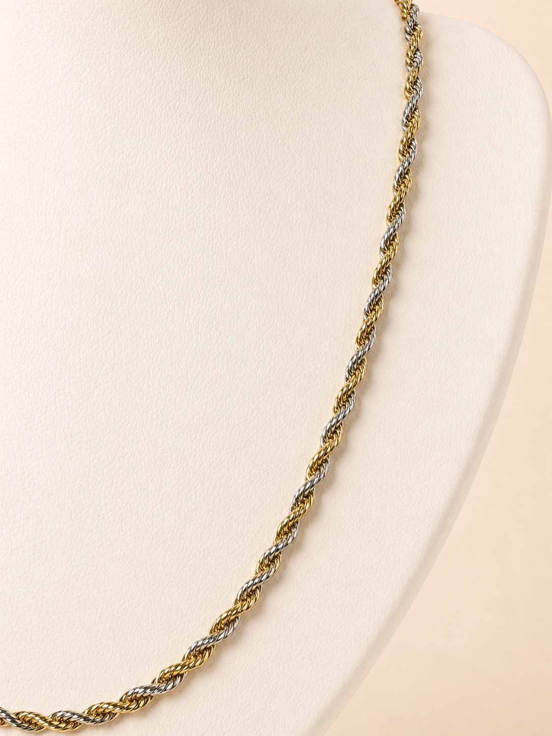 Gracias a su largo de 60 cm, puede usarse sola como protagonista o combinarse con otras cadenas para crear composiciones modernas y equilibradas. La mezcla de tonos le da más riqueza visual y la convierte en una opción muy fácil de adaptar tanto a looks de todos los días como a ocasiones especiales.