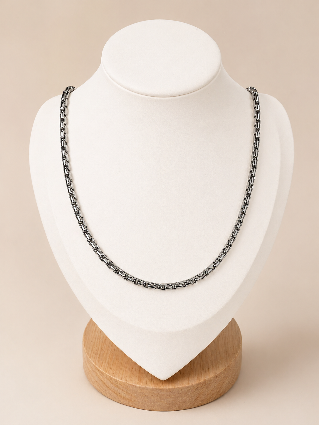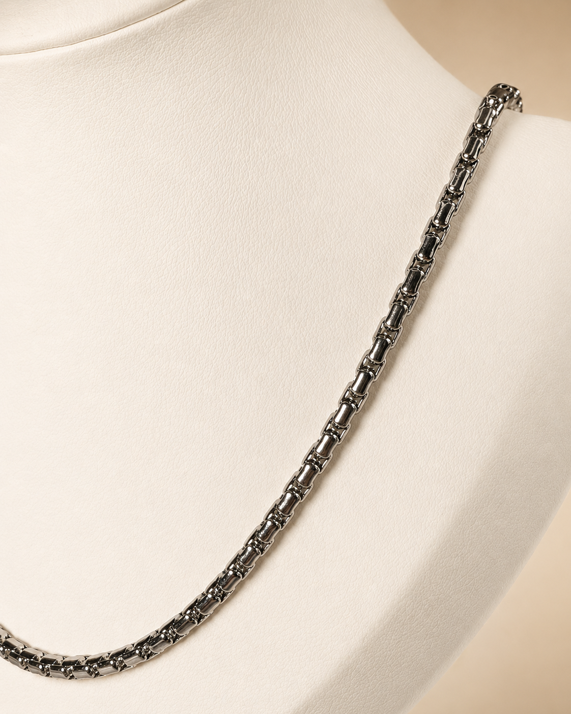 Su largo de 50 cm permite que quede muy bien sobre prendas lisas, escotes cerrados o looks en capas, funcionando tanto como pieza principal como acompañando otros collares más finos. El acero quirúrgico le da una estética moderna y práctica, pensada para el uso frecuente y para conservar un aspecto impecable.
