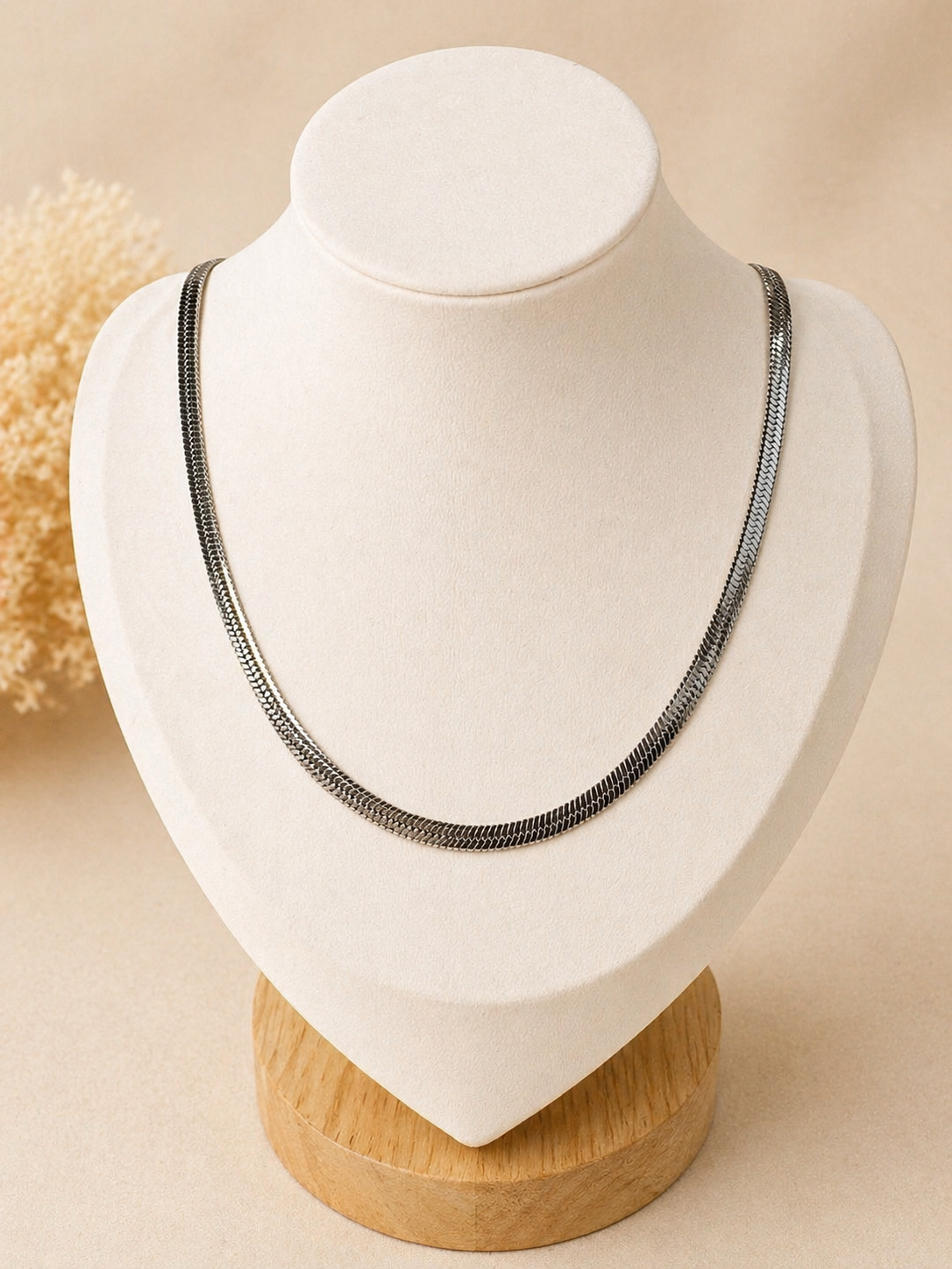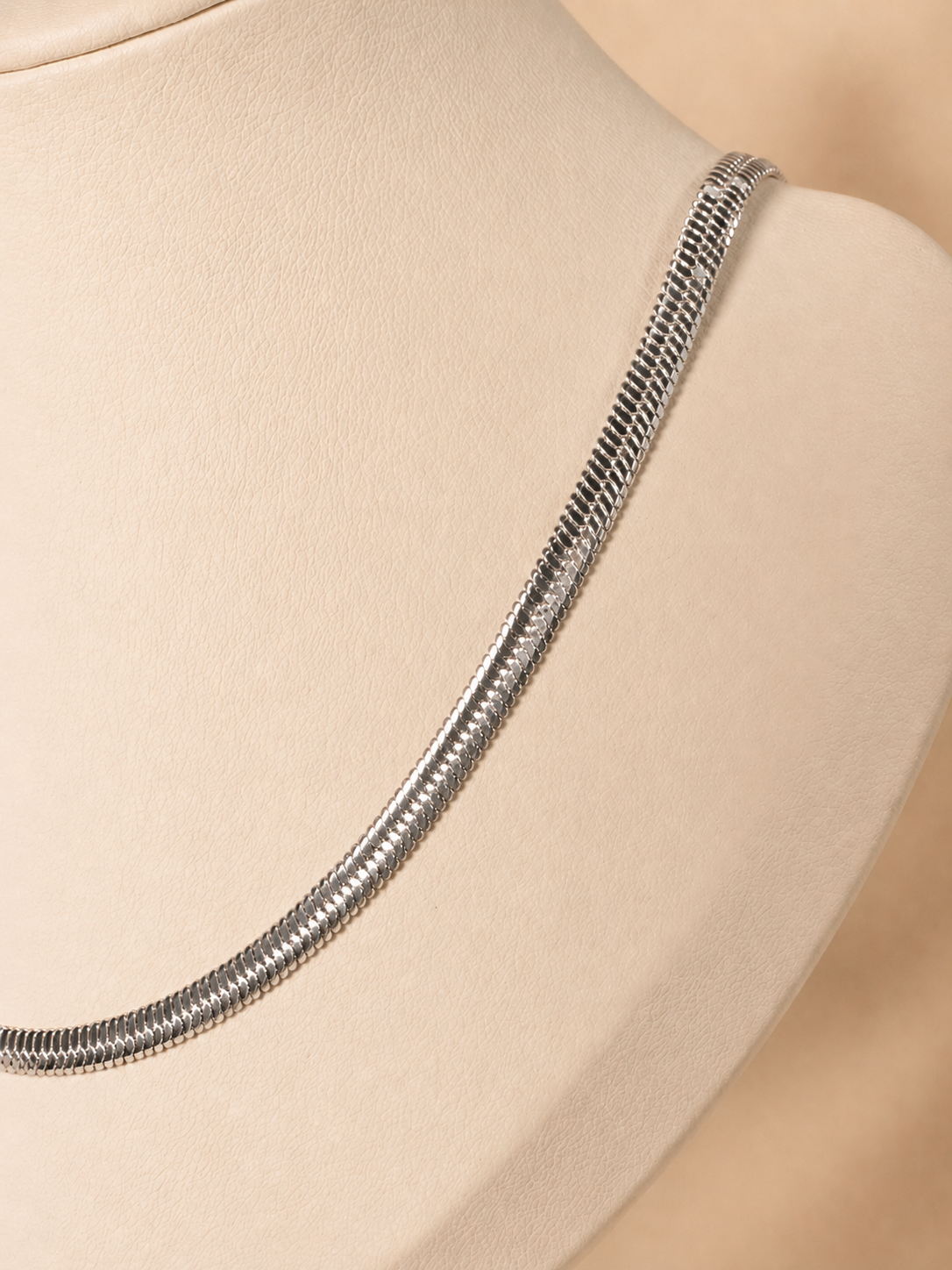 Esta cadena tipo snake en acero quirúrgico plateado se caracteriza por su superficie continua y flexible que genera un brillo parejo y sofisticado. Su estructura compacta permite que se adapte con suavidad al cuello, logrando un look limpio y moderno. Es una pieza versátil que puede usarse sola para un estilo minimalista o acompañada de dijes para un toque más personalizado.