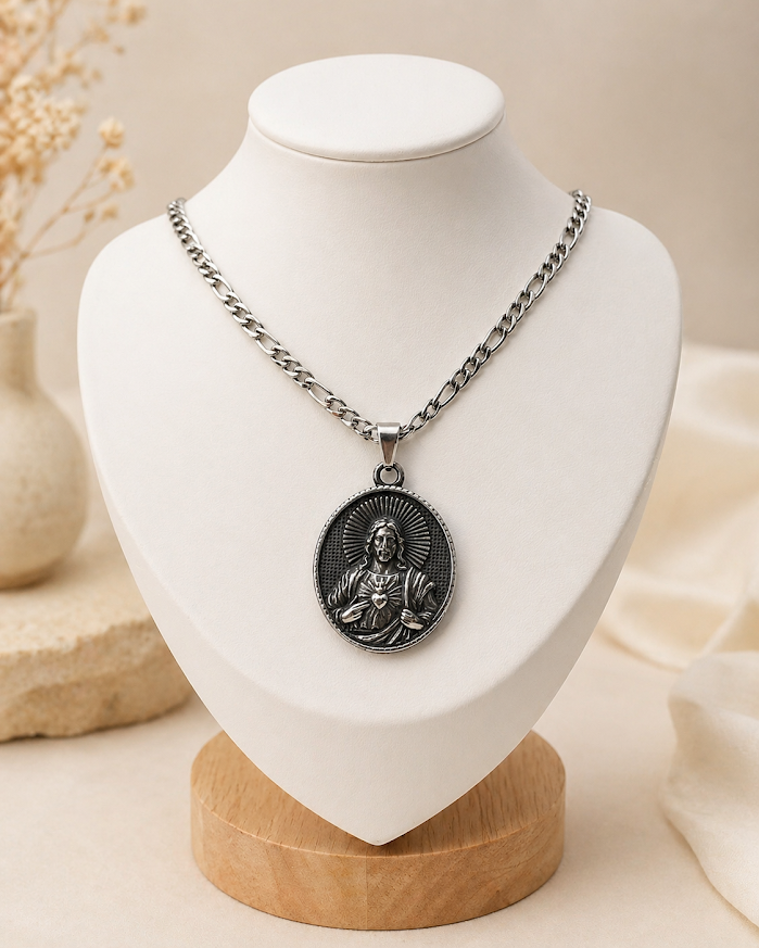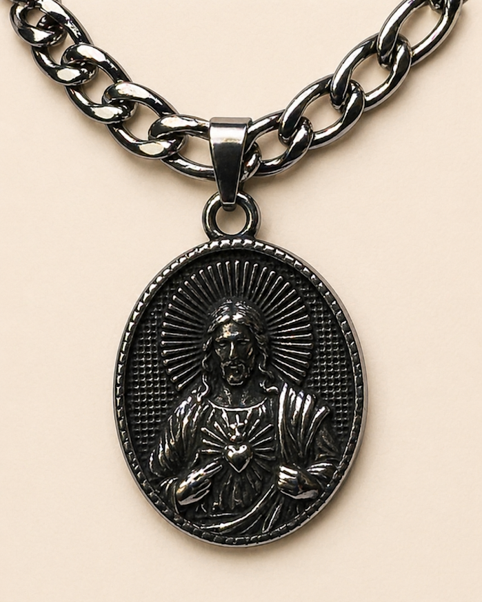 Esta cadena en acero quirúrgico con dije del Sagrado Corazón de Jesús es una pieza que transmite fe, protección y devoción en un diseño sobrio y con carácter. El relieve del dije destaca la imagen, uno de los símbolos más representativos del amor de Jesús, asociado a la compasión, la entrega, la misericordia y la fortaleza espiritual.