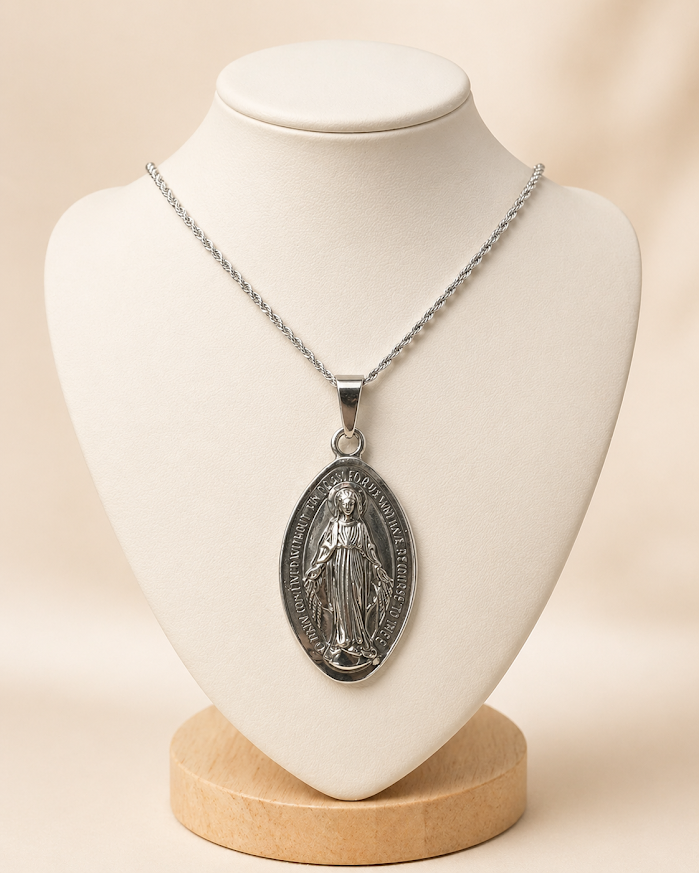 Este conjunto en acero quirúrgico con Virgen Milagrosa XL se destaca por su diseño clásico, su tamaño protagonista y su terminación elegante. El dije de mayor dimensión resalta la imagen de la Virgen Milagrosa con excelente definición, convirtiéndolo en una pieza ideal para quienes valoran los accesorios con significado espiritual y presencia visual.