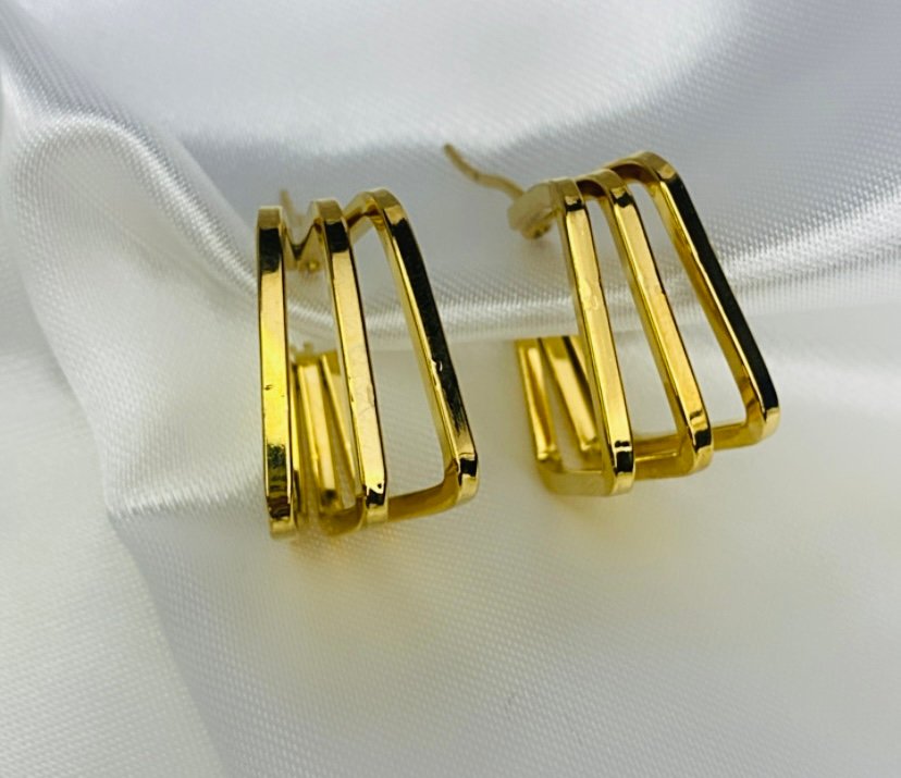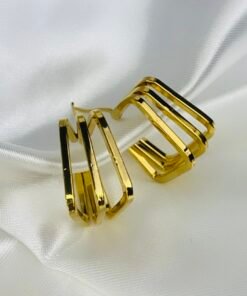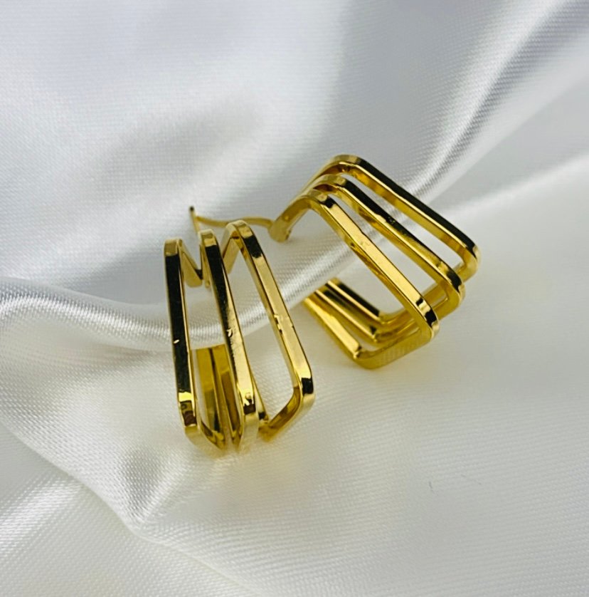 Estos aros de acero quirúrgico dorado destacan por su diseño geométrico de líneas entrelazadas, aportando un estilo moderno, sofisticado y versátil. El acabado pulido de alta calidad les brinda un brillo elegante, ideal para complementar tanto atuendos casuales como looks más formales.