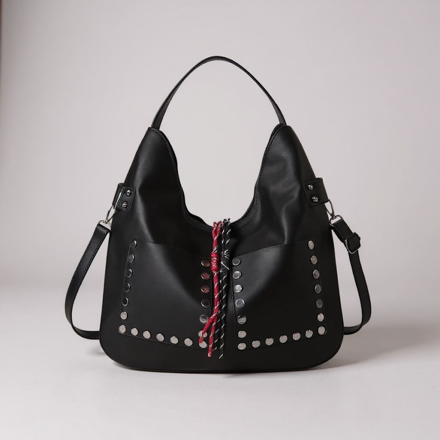 Cartera Rebel combina diseño moderno con un estilo urbano que marca presencia. Confeccionada en material suave y resistente, destaca por sus tachas plateadas, que aportan un toque rocker, y por el detalle frontal trenzado en rojo y negro, que la hace única.