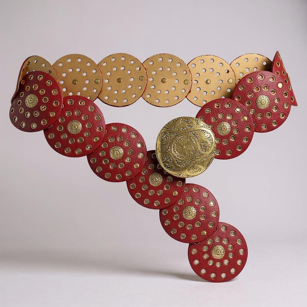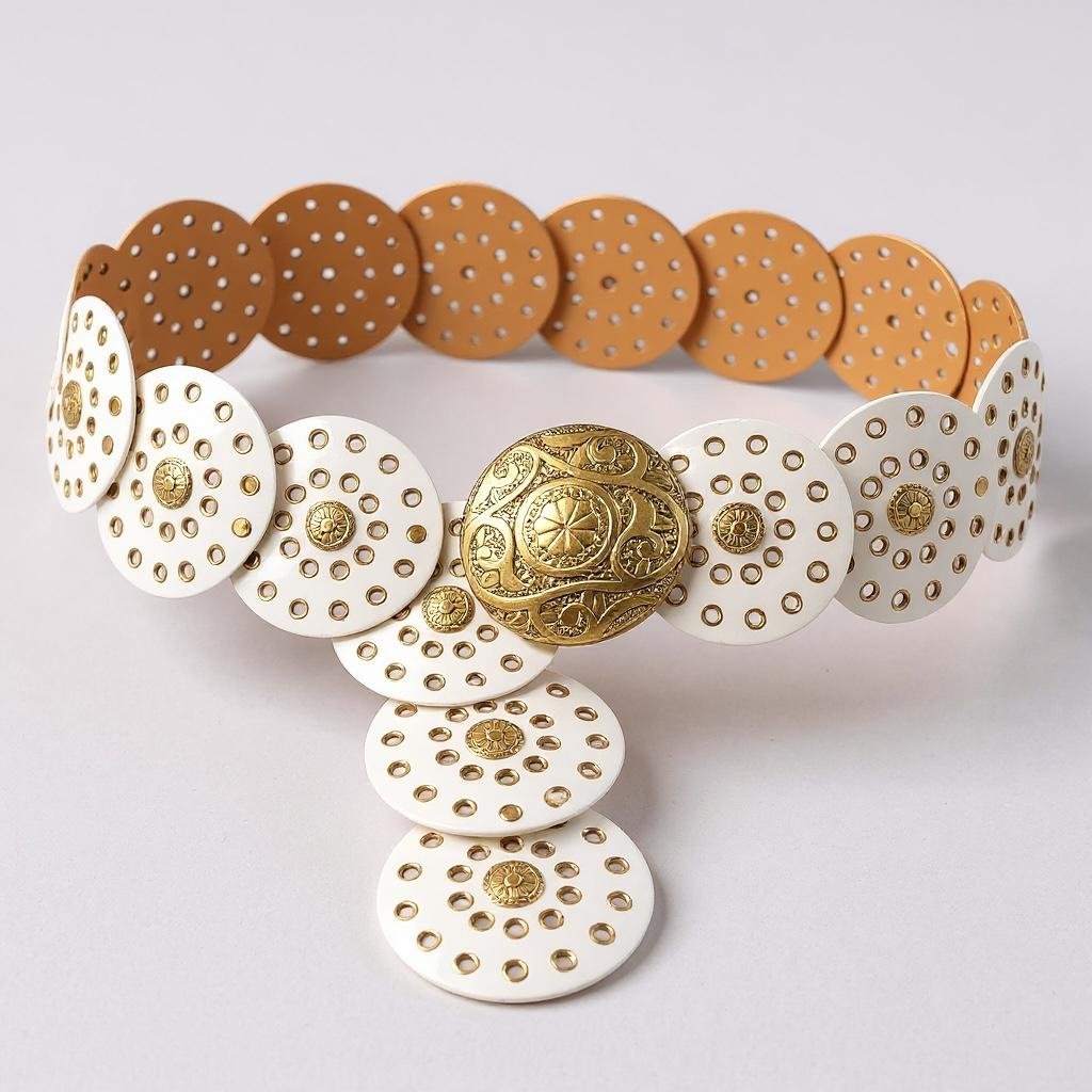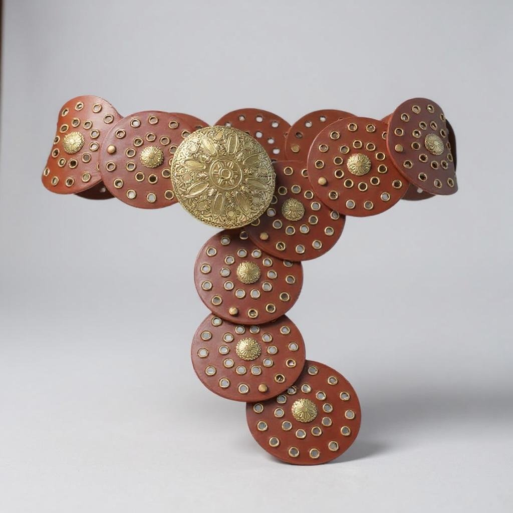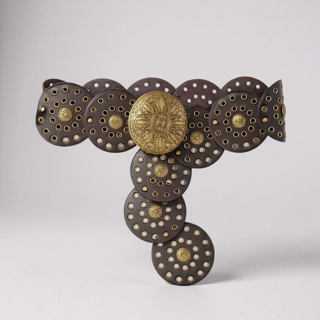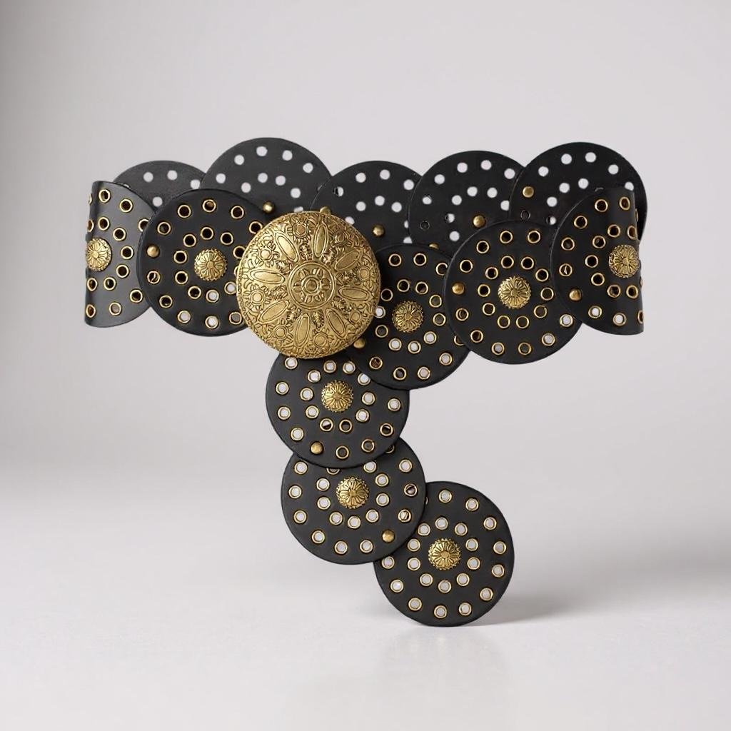 Este cinto combina diseño, estilo y calidad en una pieza que realza cualquier outfit. Su estructura esta formada por círculos calados con detalles metálicos, unidos entre si para crear un diseño llamativo y moderno. La hebilla central, trabajada con relieve y aporta un toque artesanal.