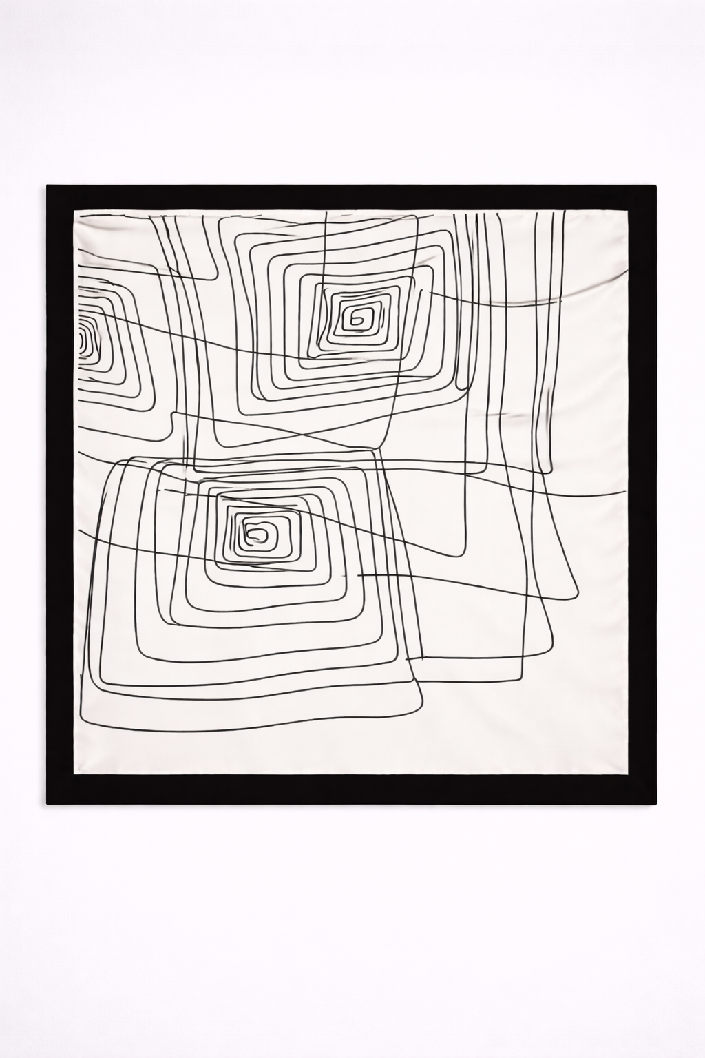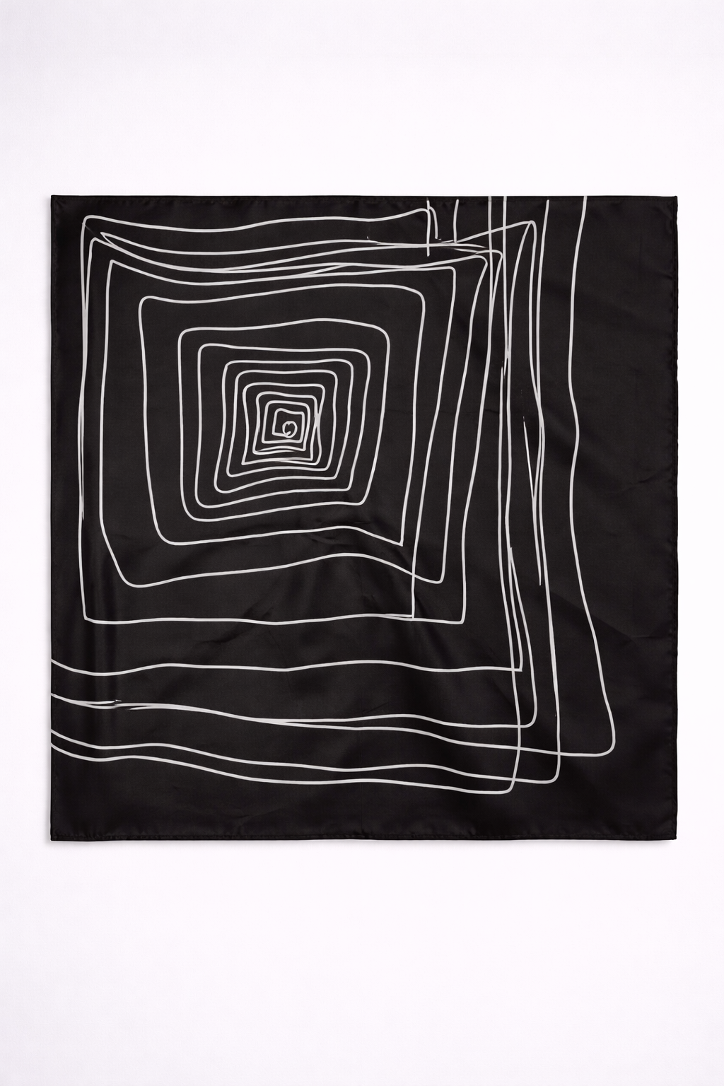 El formato cuadrado permite diferentes formas de uso: al cuello, en el cabello, atado a la cartera. Su diseño de líneas abstractas le da un estilo moderno y distintivo, convirtiéndolo en una pieza ideal para complementar tanto looks casuales como más arreglados.