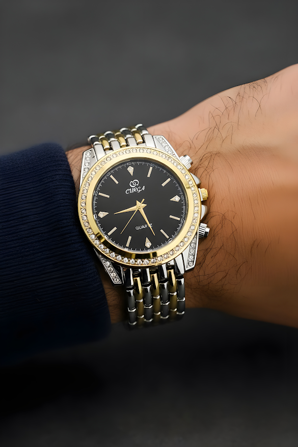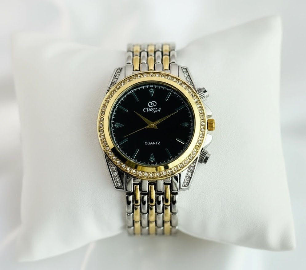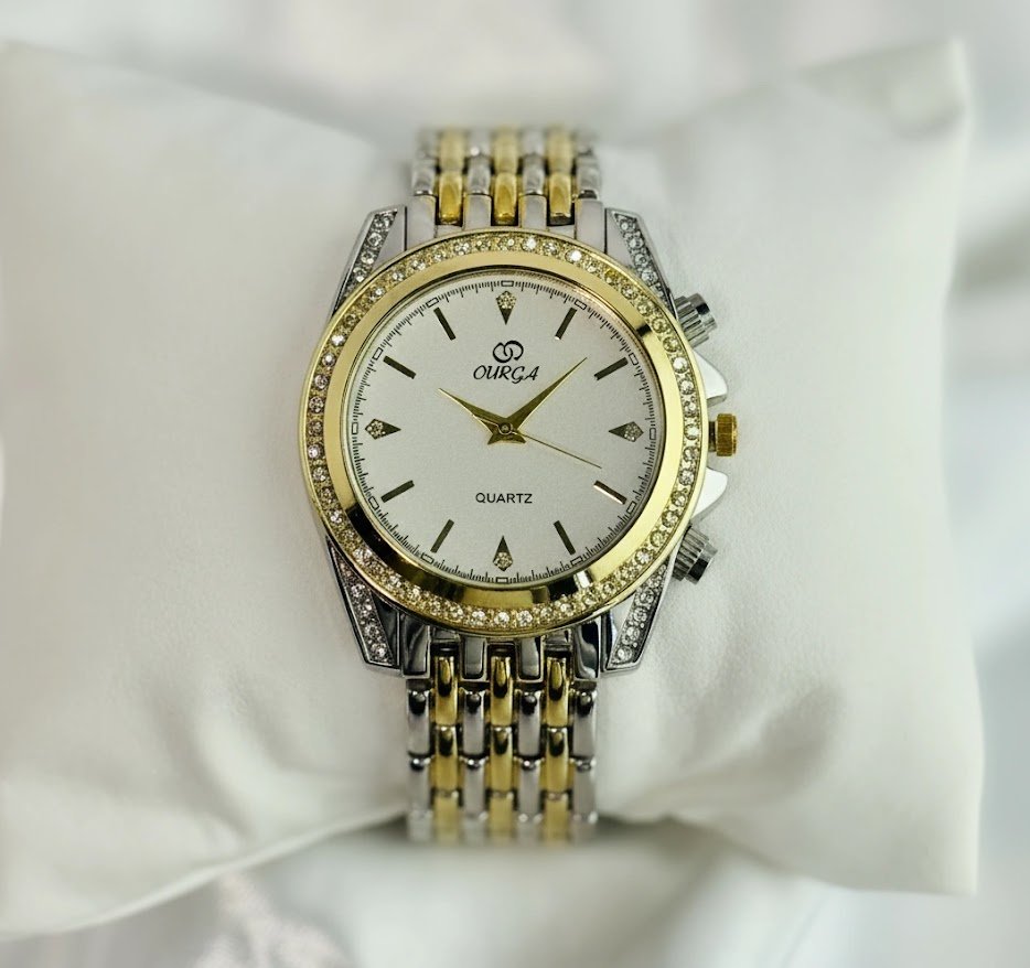 Reloj pulsera combinado plateado y dorado con detalle de brillitos en el bisel. Tiene movimiento Quartz y malla metálica cómoda para usar todo el día. Es de esos relojes que levantan cualquier look: va con camisa, remera o salida de noche. Lectura clara, cierre seguro.