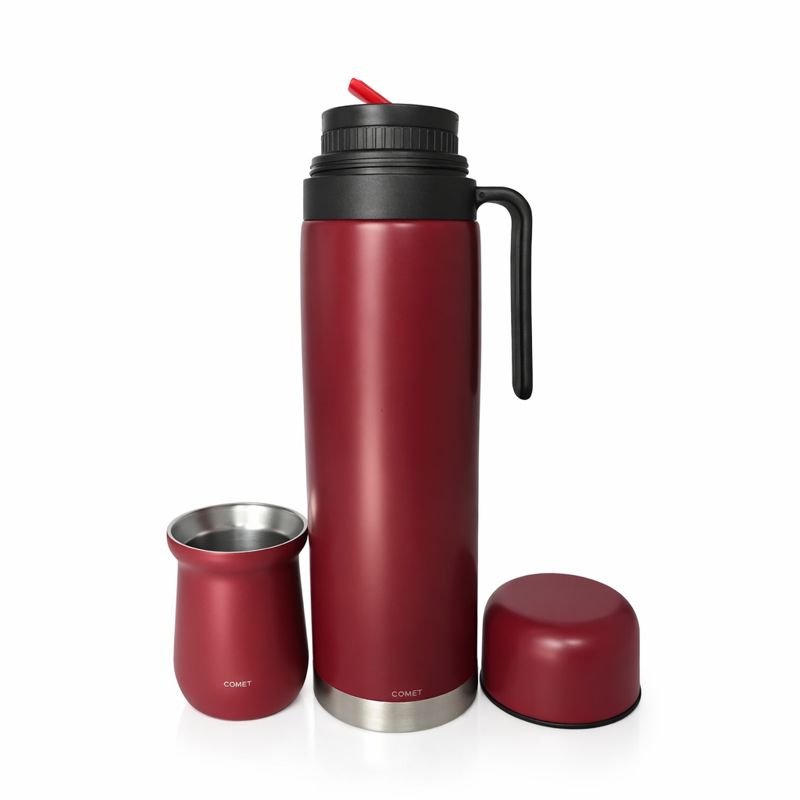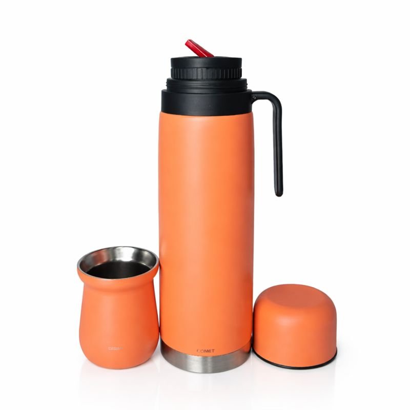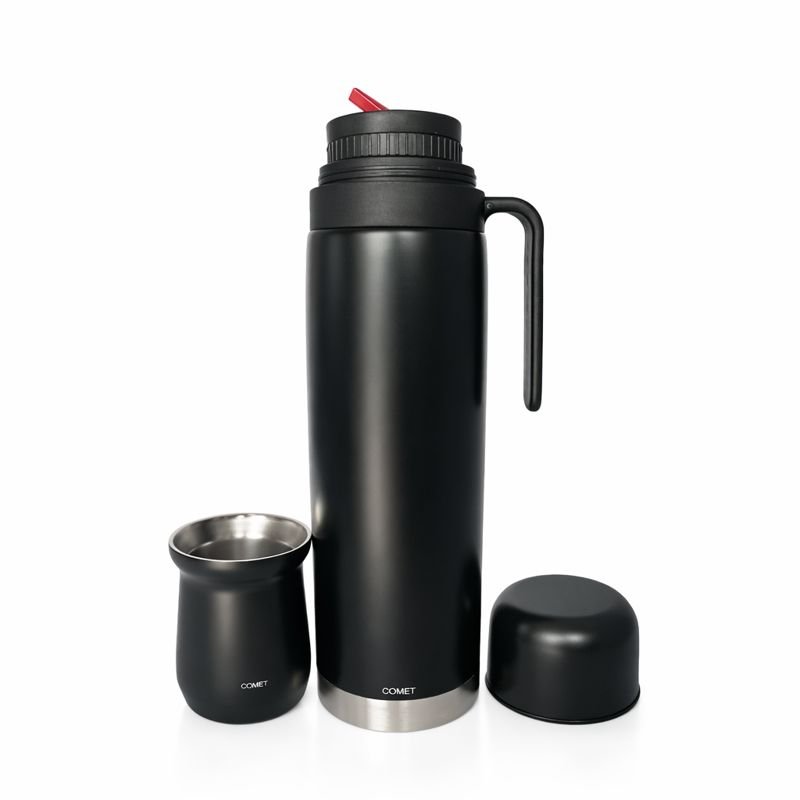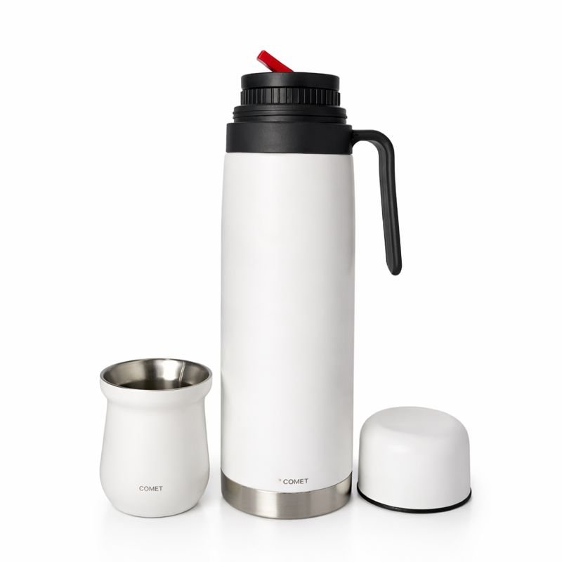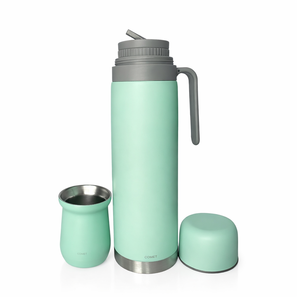 Incluye pico cebador, tapa hermética y asa ergonómica para un agarre cómodo y seguro. El mate, también de acero inoxidable, es resistente, fácil de limpiar y mantiene la temperatura sin transmitir calor en el exterior.